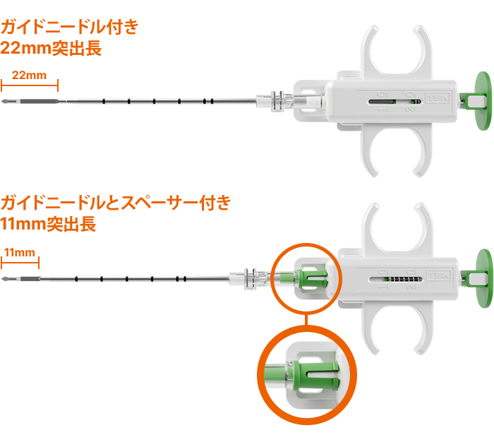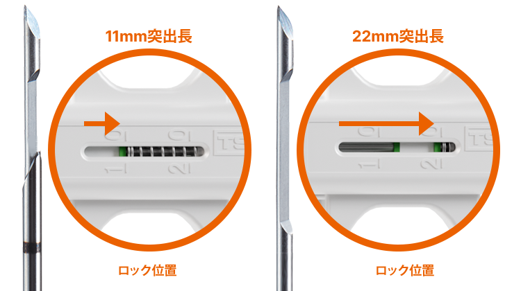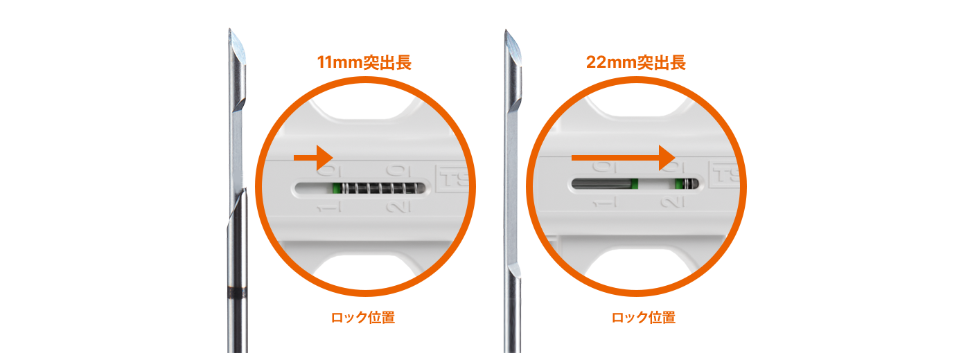 手技に応じて11mm、22mmの針突出長のいずれかを選択できます。